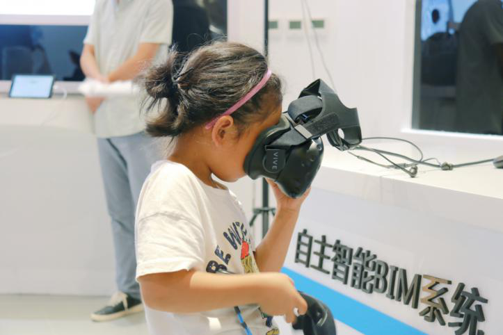 图:小朋友试戴VR眼镜体验自主智能BIM系统