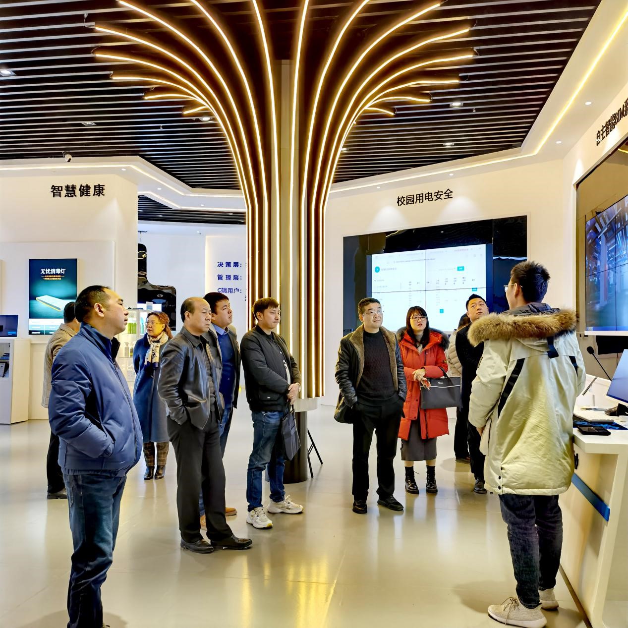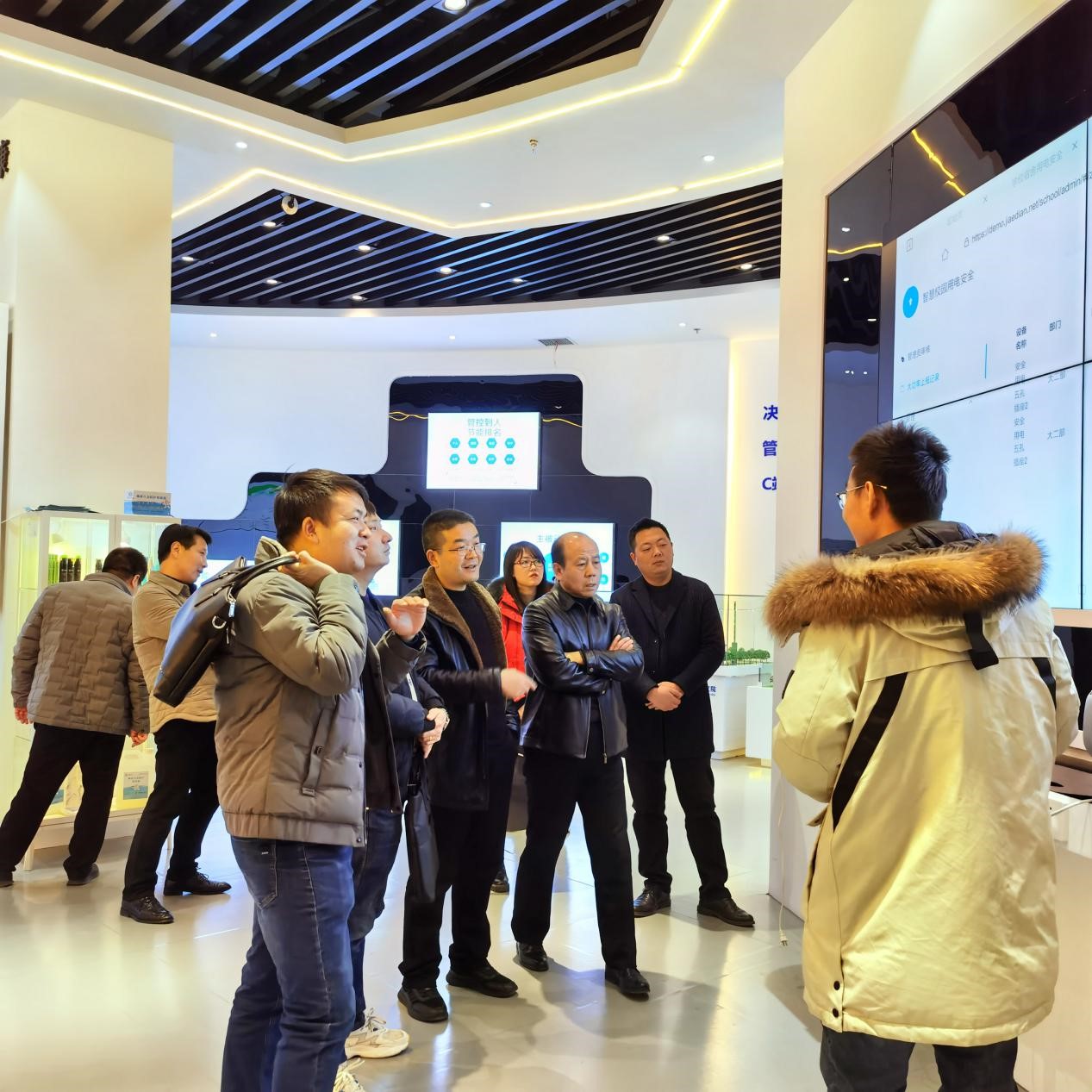 到访领导全面了解我院建设及发展现状,科研团队取得的技术成果,产业转化涉及的领域等情况后,重点对能源综合管控系统、智慧校园及教室系统、智慧酒店系统等进行详细了解,特别是物联网节能管控技术的功能、适用范围、节能效果及综合收益等,同时对我院自主开发的物联网系列技术给予称赞。