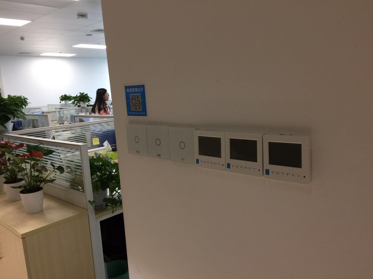 经过整体规划与改造,利用基于物联网技术的系统和产品,实现对整层办公大楼的设备(灯开关﹑风机盘管控制器﹑电源插座﹑窗帘﹑浇花等)进行智能化﹑自动化控制和管理,从而实现节能。改造后的办公环境,收到了公司领导及员工的热烈好评。